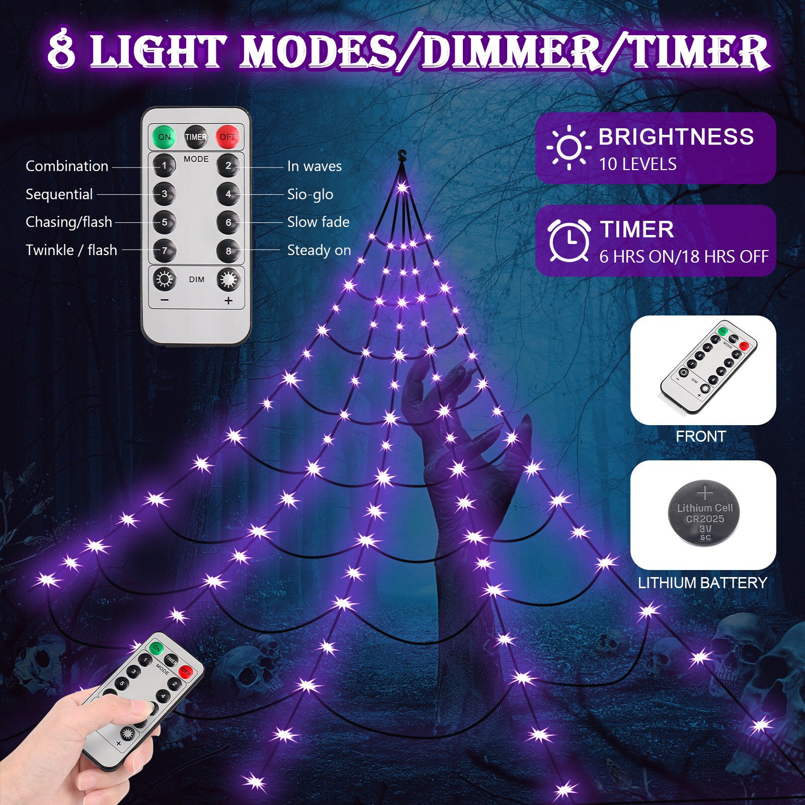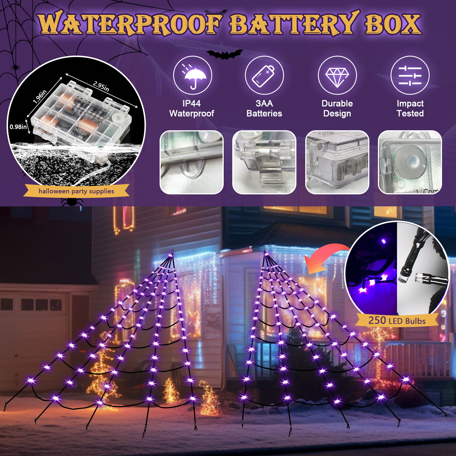 ️【Durable Halloween Cobwebs】The triangular spider web is made of sturdy polyester fabric blend with good toughness, not easy to tangle up and reusable. Stretch spider web is flexible enough to pull into any shapes. 5 ground spikes can effectively strengthen the spider web to withstand stormy weather. The waterproof battery box increases safety and reduces the probability of leakage.